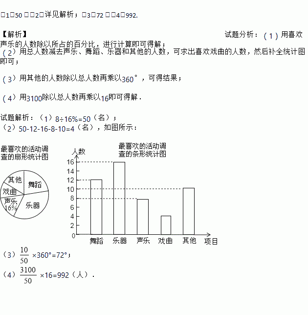 (4)若该校共有3100名学生,请你估计全校对“乐器”最喜欢的人数是________人.