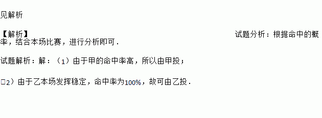 某篮球队在平时训练中,运动员甲的3分球命中率是70%,运动员乙的3分球命中率是50%.在一场比赛中,甲投3分球4次,命中一次;乙投3分球4次,全部命中.全场比赛即将结束,甲、乙两人所在球队还落后对方球队2分,但只有最后一次进攻机会了,若你是这个球队的教练,问:最后一个3分球由甲、乙中谁来投,获胜的机会更大?请简要说说你的理由.