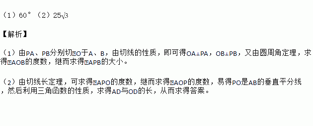 如图,PA,PB分别切⊙O于点A,B,连结PO,AB相交于点D,C是⊙O上一点,∠C=60°.