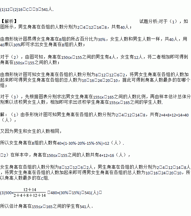 (3)已知该校共有男生500人,女生480人,请估计身高在155≤x<165之间的学生有多少人.