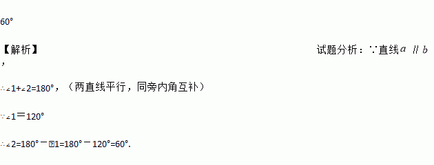 如图,已知直线∥,∠1=120°,则∠2的度数是 .