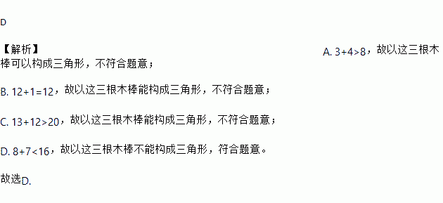 下列四组数分别是三根木棒的长度,用它们不能拼成三角形的是( )