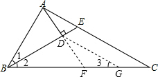 分析:根据角平分线的定义可得∠1=∠2,然后求出∠2=∠C,再根据等角对等边可得BE=CE,结合图形AC-CE=AE即可得到①正确;延长AD交BC与F,利用“角边角”证明△ABD和△FBD全等,根据全等三角形对应角相等可得∠BAD=∠AFB,再根据三角形的一个外角等于与它不相邻的两个内角的和列式即可得到∠BAD-∠C=∠DAE,从而的得到②正确;根据直角三角形两锐角互余用∠C表示出∠BAD,再代入②整理可得∠DAE=90°-2∠C,得到③错误;取CF的中点G,连接DG,根据三角形的中位线平行于第三边并且等于第三边的一半可得DG∥AC,AC=2DG,再根据两直线平行,同位角相等可得∠C=∠3,然后求出∠2=∠3,根据等角对等边可得BD=DG,从而得到AC=2BD,判定④正确.