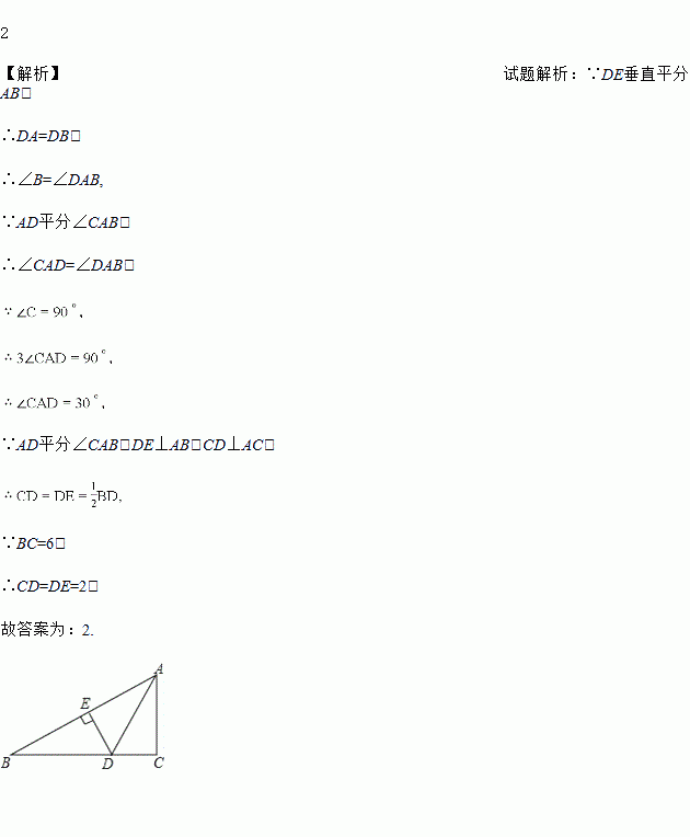 如图,在Rt△ABC中,∠C=90°,∠CAB的平分线交BC于D,DE是AB的垂直平分线,垂足为E,若BC=6,则DE的长为_____.