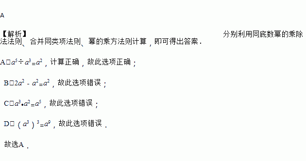 A. a5÷a2=a3 B. 2a2-a2=2 C. a3·a2=a6 D. (a3)3=a6