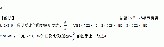 A 【解析】试题分析:根据题意得k=2×3=6,所以反比例函数解析式为y=,∵﹣3×(﹣2)=6,2×(﹣3)=﹣6,3×(﹣2)=﹣6,﹣2×3=﹣6,∴点(﹣3,﹣2)在反比例函数y=的图象上.故选A.