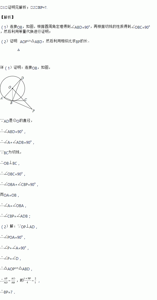 如图,AD是⊙O的直径,AB为⊙O的弦,OP⊥AD,OP与AB的延长线交于点P,过B点的切线交OP于点C.