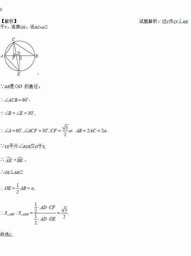 如图,△ABC内接于⊙O,AB是⊙O的直径,CE平分∠ACB交⊙O于E,∠E=30°,交AB于点D,连接AE,则S△ADC∶S△ADE的比值为( )