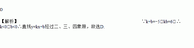 D 【解析】∵k+b=?5、kb=6,∴k<0,b<0∴直线y=kx+b经过二、三、四象限,故选D.