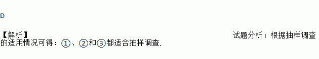 D 【解析】试题分析:根据抽样调查的适用情况可得:①、②和③都适合抽样调查.