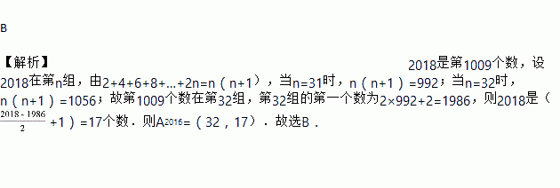 则现有等式Am=(i,j)表示正偶数m是第i组第j个数(从左到右数),如A10=(2,3),则A2018=( )