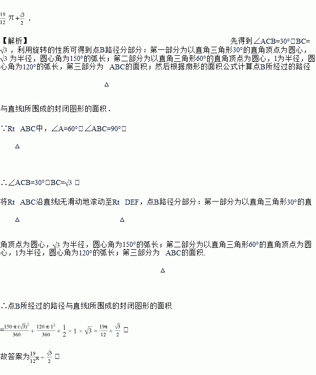 在Rt△ABC中,AB=1,∠A=60°,∠ABC=90°,如图所示将Rt△ABC沿直线l无滑动地滚动至Rt△DEF,则点B所经过的路径与直线l所围成的封闭图形的面积为_____.(结果不取近似值)