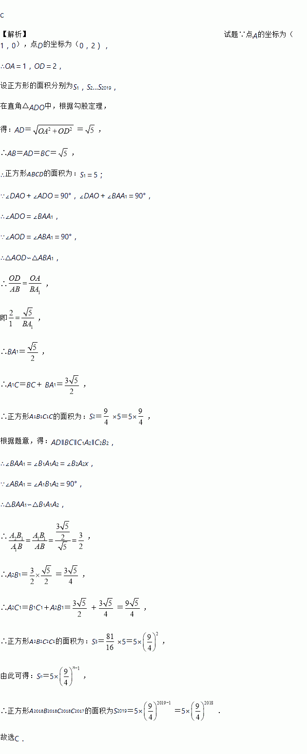 在平面坐标系中,正方形ABCD的位置如图所示,点A的坐标为(1,0),点D的坐标为(0,2),延长CB交x轴于点A1,作正方形A1B1C1C,延长C1B1交x轴于点A2,作正方形A2B2C2C1,………按这样的规律进行下去,正方形A2018B2018C2018C2017的面积为( )