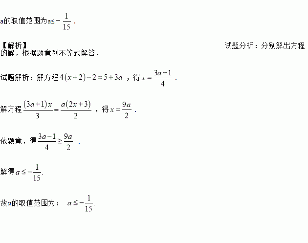 已知关于x的方程4(x+2)-2=5+3a的解不小于方程的解,试求a的取值范围.