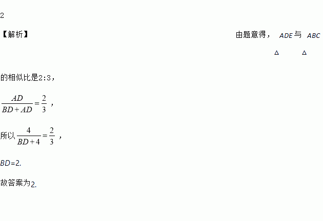 如图,在△ABC中,D,E分别是边AB,AC上的点,且DE∥BC,若△ADE与△ABC的周长之比为2∶3,AD=4,则DB=_______.