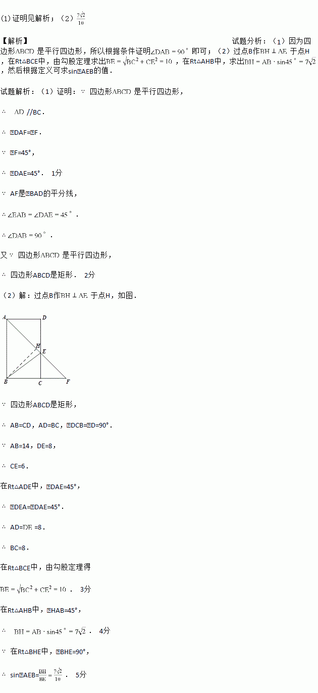 (1)求证:四边形ABCD是矩形;(2)若AB=14,DE=8,求sin∠AEB的值.