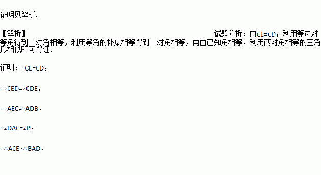 如图,D是△ABC的BC边上一点,E为AD上一点,若∠DAC=∠B,CD=CE,试说明△ACE∽△BAD.