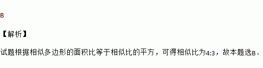 如果两个相似多边形的面积比为16:9,那么这两个相似多边形的相似比为( )