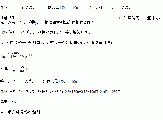 (2)今年学校计划购买这种篮球和足球共10个,恰逢商场在搞促销活动,篮球打九折,足球打八五折,若此次购买两种球的总费用不超过1050元,则最多可购买多少个篮球?