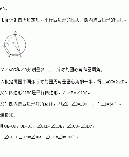 如图,点A、B、C、D在⊙O上,O点在∠D的内部,四边形OABC为平行四边形,则∠OAD+∠OCD= ▲ °.