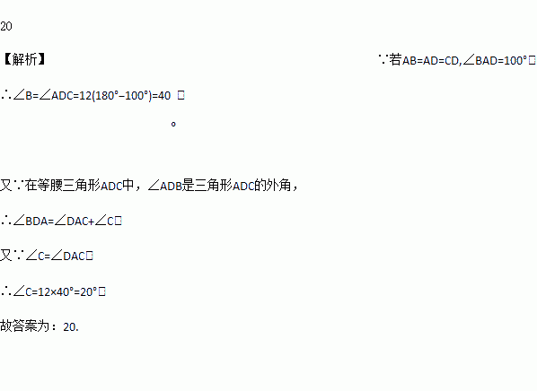 如图,△ABC中,点D在边BC上,若AB=AD=CD,∠BAD=100°,则∠C=___度.