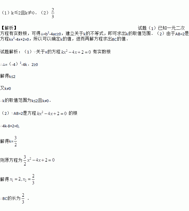 (2)若△ABC中,AB=AC=2,AB、BC的长是方程kx2-4x+2=0的两根,求BC的长.
