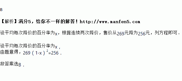 某商品原价元,经连续两次降价后,售价为元.设平均每次降价的百分率为,则可列方程为( )