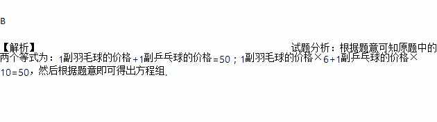 为了丰富同学们的课余生活,体育委员小强到体育用品商店购羽毛球拍和乒乓球拍,若购1副羽毛球拍和1副乒乓球拍共需50元,小强一共用320元购买了6副同样的羽毛球拍和10副同样的乒乓球拍,若设每副羽毛球拍为x元,每副乒乓球拍为y元,列二元一次方程组得