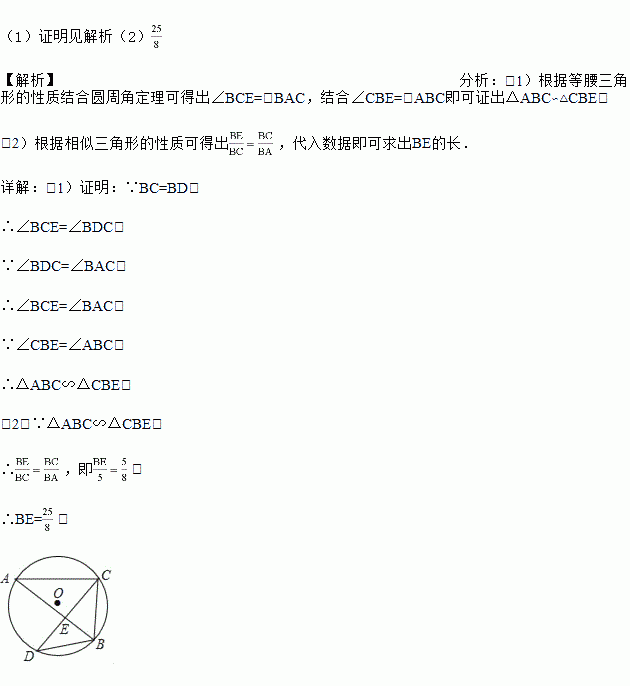 如图,在△ABC中,AB=8,BC=5,AC=7,点D在△ABC的外接圆⊙O上,BC=BD,CD交AB于点E.