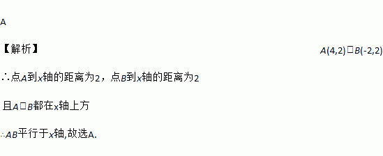 A 【解析】A(4,2),B(-2,2) ∴点A到x轴的距离为2,点B到x轴的距离为2 且A、B都在x轴上方 ∴AB平行于x轴,故选A.