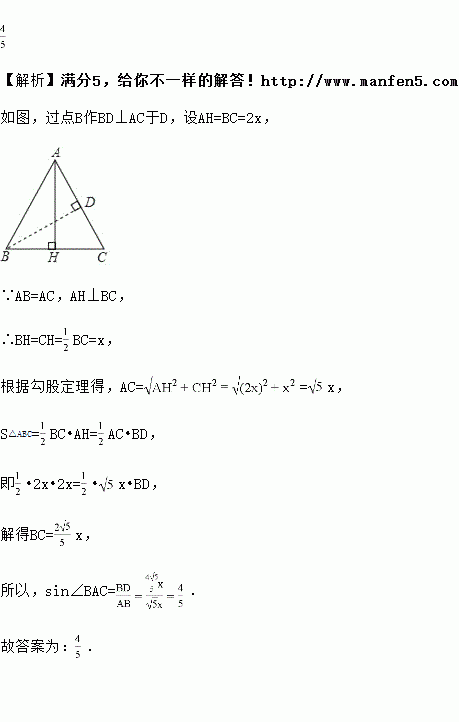 如图,在△ABC中,AB=AC,AH⊥BC,垂足为点H,如果AH=BC,那么sin∠BAC的值是____.