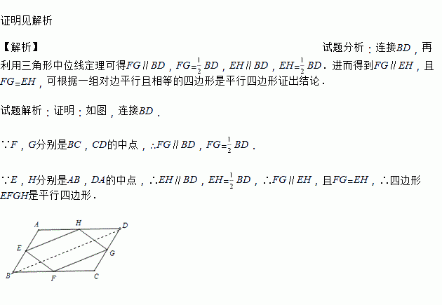 如图,在平行四边形ABCD中,E、F、G、H分别是各边中点。求证:四边形EFGH是平行四边形。