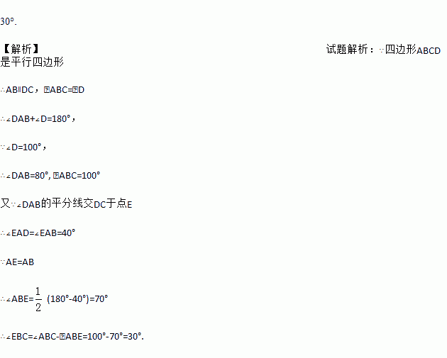 如图,在?ABCD中,∠D=100°,∠DAB的平分线AE交DC于点E,连接BE.若AE=AB,则∠EBC的度数为 .