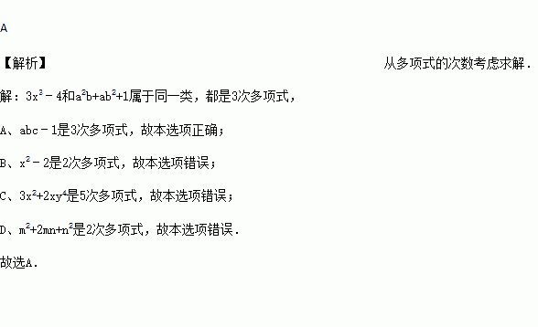 按某种标准把多项式进行分类时,3x3﹣4和a2b+ab2+1属于同一类,则下列哪一个多项式也属于此类( )
