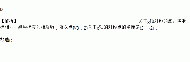 D 【解析】关于x轴对称的点,横坐标相同,纵坐标互为相反数,所以点P(3,2)关于x轴的对称点的坐标是(3,-2), 故选D.