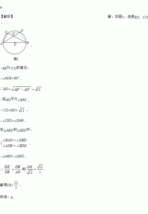 如图,AB为⊙O的直径,C为⊙O上一点,弦AD平分∠BAC,交BC于点E,AB=6,AD=5,则DE的长为( )