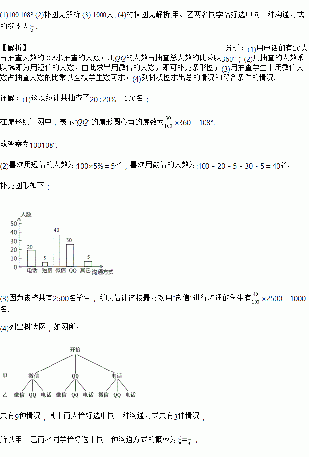 (4)某天甲、乙两名同学都想从“微信”“QQ”“电话”三种沟通方式中选一种方式与对方联系,请用列表或画树状图的方法求出甲、乙两名同学恰好选择同一种沟通方式的概率.