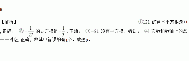 下列说法: 的算术平方根是11; 的立方根是; 的平方根是; 实数和数轴上的点一一对应,其中错误的有