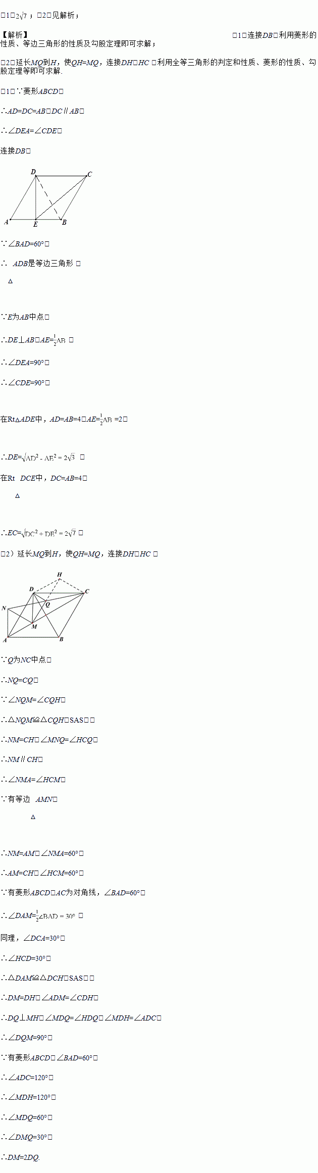 (2)如图2,M为线段AC上一点(不与A、C重合),以AM为边向上构造等边三角形AMN,连接NC、DM,Q为线段NC的中点,连接DQ、MQ,判断DM与DQ的数量关系,并证明你的结论.