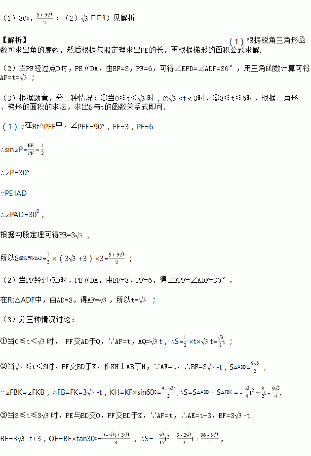 如图1,在矩形ABCD中,DB=6,AD=3,在Rt△PEF中,∠PEF=90°,EF=3,PF=6,△PEF(点F和点A重合)的边EF和矩形的边AB在同一直线上.现将Rt△PEF从A以每秒1个单位的速度向射线AB方向匀速平移,当点F与点B重合时停止运动,设运动时间为t秒,