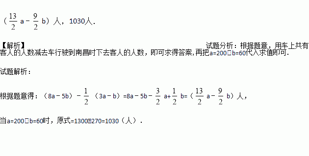 某天深圳开往北京(西)的列出上原载客(3a﹣b)人,当车行驶到南昌时,下去了一半客人,又上来了若干人,此时车上共有客人(8a﹣5b)人,问上车的乘客是多少人?当a=200,b=60时,上车的乘客是多少人?