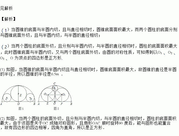 问题:要将一块直径为的半圆形铁皮加工成一个圆柱的两个底面和一个圆锥的底面.![]()