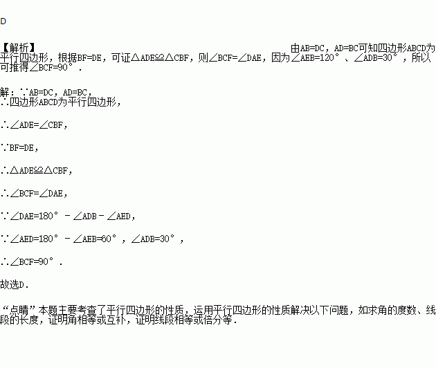 如图,已知AB=DC,AD=BC,E,F在DB上两点且BF=DE,若∠AEB=120°,∠ADB=30°,则∠BCF= ( )