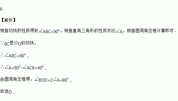 如图,AB是⊙O的直径,BC与⊙O相切于点B,AC交⊙O于点D,若∠ACB=50°,则∠BOD等于( )