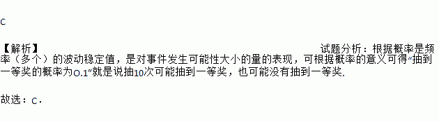 商场举行摸奖促销活动,对于“抽到一等奖的概率为0.1”。下列说法正确的是( )