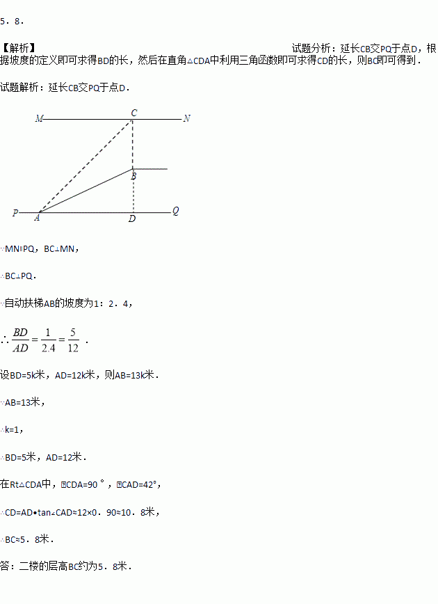如图1,某超市从一楼到二楼有一自动扶梯,图2是侧面示意图.已知自动扶梯AB的坡度为1:2.4,AB的长度是13米,MN是二楼楼顶,MN∥PQ,C是MN上处在自动扶梯顶端B点正上方的一点,BC⊥MN,在自动扶梯底端A处测得C点的仰角为42°,求二楼的层高BC约为多少米?( sin42°≈0.7,tan42°≈0.9)