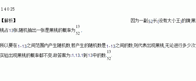从一副52张(没有大小王)的扑克牌中每次抽出l张.然后放 回洗匀再抽,研究恰好出现“黑桃”的机会,若用计算器模拟试验,则要在____到______范围中产生随机数,若产生随机数是_____,则代表“出现黑桃”,否则就不是,无论进行多少次试验都可以知道“出现黑桃”的机会为_____.