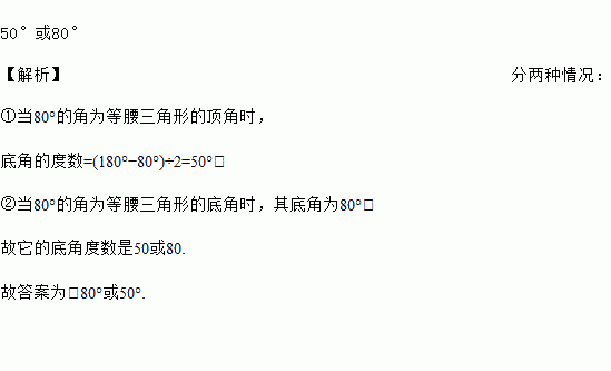 50°或80° 【解析】分两种情况: ①当80°的角为等腰三角形的顶角时, 底角的度数=(180°?80°)÷2=50°; ②当80°的角为等腰三角形的底角时,其底角为80°, 故它的底角度数是50或80. 故答案为:80°或50°.