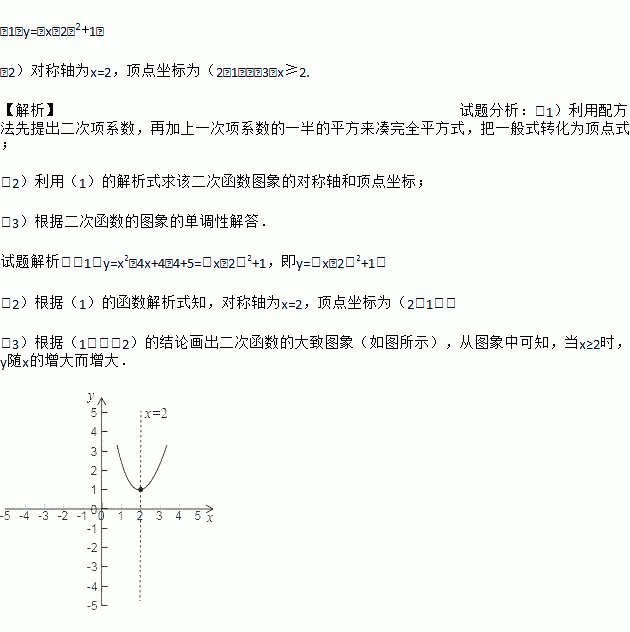 (1)y=(x﹣2)2+1; (2)对称轴为x=2,顶点坐标为(2,1);(3)x≥2. 【解析】试题分析:(1)利用配方法先提出二次项系数,再加上一次项系数的一半的平方来凑完全平方式,把一般式转化为顶点式; (2)利用(1)的解析式求该二次函数图象的对称轴和顶点坐标; (3)根据二次函数的图象的单调性解答. 试题解析:(1)y=x2﹣4x+4﹣4+5=(x﹣2)2+...