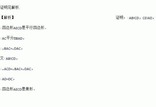 (题文)如图,四边形ABCD中,AB//CD,AC平分∠BAD,CE//AD交AB于E.